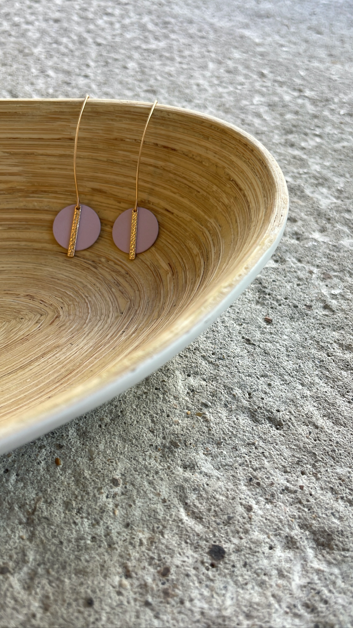 lange oorbellen met een ellips oorhaak in het mat goud en een berubberd schijfje in een kleur