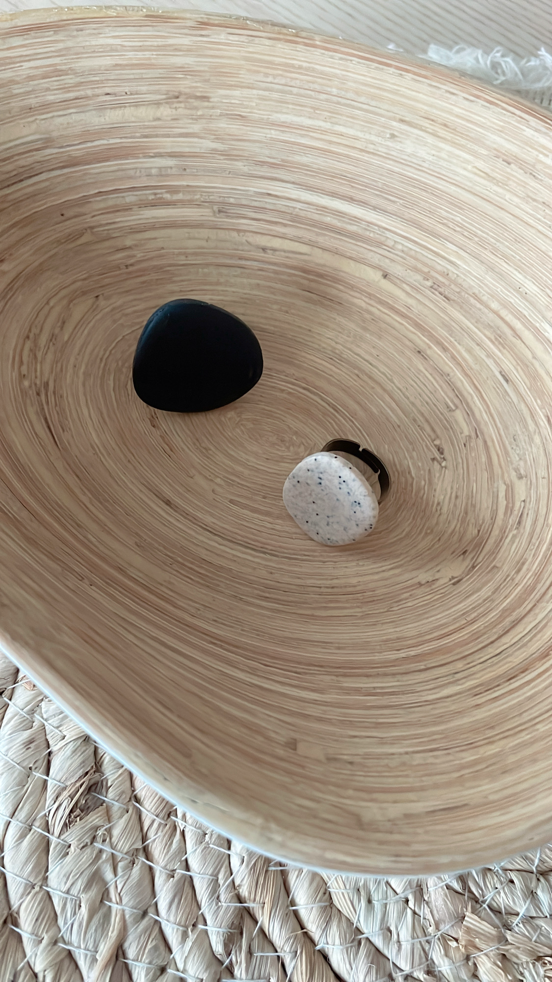 een ring uit metaal met een handgemaakte bedel uit klei
